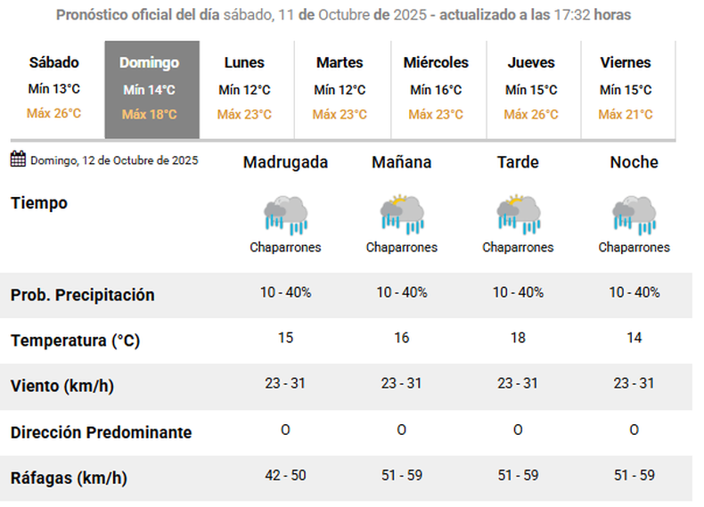 Después de una jornada cálida y mayormente nublada, el domingo traerá un cambio de condiciones en La Plata, con el regreso de los chaparrones y un leve descenso de la temperatura, según informó el Servicio Meteorológico Nacional (SMN). Las lluvias se mantendrán durante todo el día, con alta humedad y vientos moderados del sector oeste, aunque se espera que el panorama comience a mejorar a partir del inicio de semana.